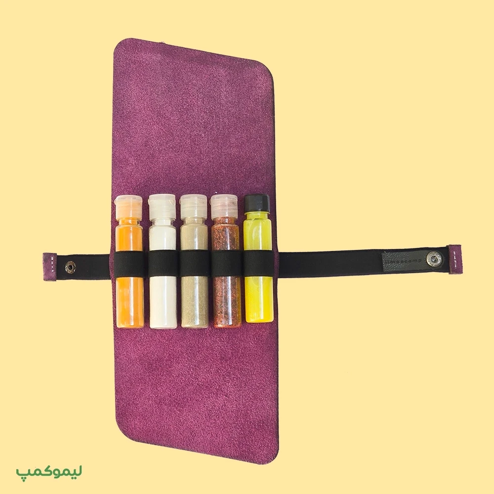 کیف ادویه چرم مصنوعی لیموکمپ! طراحی منحصر به فرد و بند دکمه دار جهت آویزان کردن چهار عدد محفظه شیشه ای - ظرفیت هر محفظه 15 گرم (نمک) چوب پنبه ی با دوام پلاستیکی نرم چرم مصنوعی مرغوب وزن 145 گرم ابعاد 13 × 7 × 4 سانتی متر