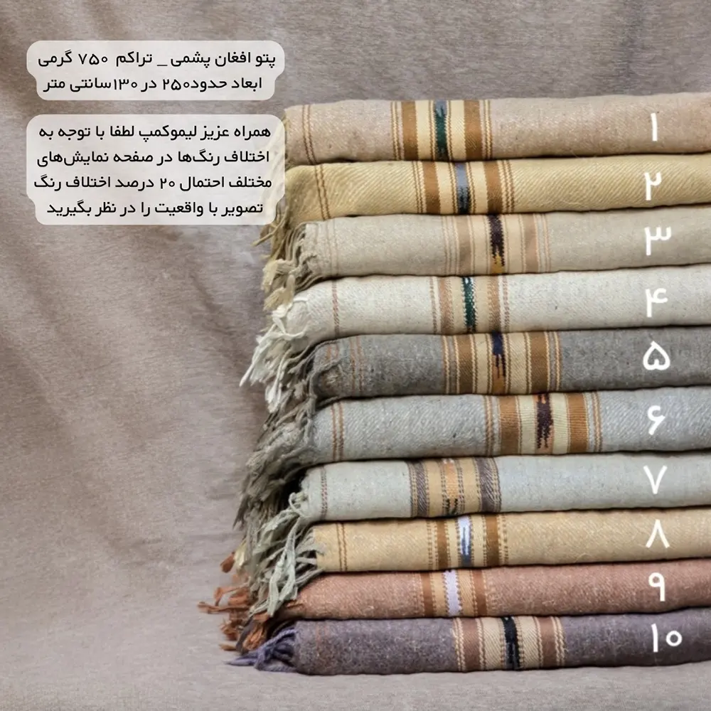 پتو افغان پشمی یا شال افغان پشمی یکی از محصولات کاربردی و بسیار زیبایی است که توانسته است به عنوان یکی از پرفروشترین محصولات در دنیای سفر و کمپینگ و مد و طراحی جا بگیرد. شال افغانی یا پتو افعانی، بافتی زیبا و الگوهای متنوع دارد که معمولاً از رنگها و طرحهای سنتی فرهنگ افغانستان الهام میگیرد. در بافت این پتو افغان از پشم طبیعی استفاده شده که گرمای عالی و دوام فوقالعادهای دارد.به دلیل ماهیت پشمی در ابتدای استفاده ممکن است کمی زبر باشد، اما با شستوشو و مرور زمان نرمتر و لطیفتر خواهد شد. طراحی آن بهگونهای است که میتوانید بهراحتی دور خود بپیچید و از گرمای دلپذیرش لذت ببرید.برای حس راحتی بیشتر، پیشنهاد میکنیم روی لباس از آن استفاده کنید. شال یا پتوی افغان به اندازهها و ابعاد مختلفی تولید میشود. این محصولات در اندازه 130×250 سانتیمتر و وزن 750 گرمی میباشند.برای نگهداری از شال یا پتوی افغان، توصیه میشود آنها را در آب با دست و یا ماشین لباسشویی با آب سرد و ملایم شستشو دهید. سپس آنها را به آرامی خشک کنید تا از آن به خوبی محافظت شود.